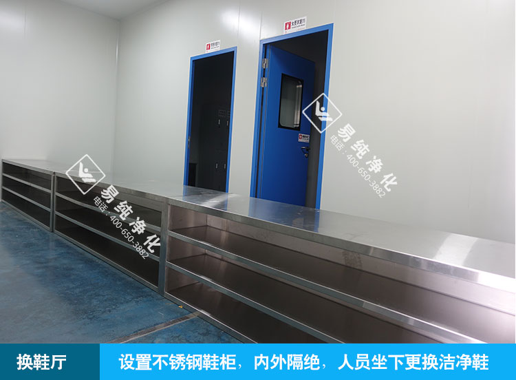 1 肉類加工車間屬于潔凈廠房,員工進(jìn)入車間需按照以下程序進(jìn)行:換鞋→一次更衣→二次更衣→手部、腳靴消毒→風(fēng)淋室除塵,由此,更衣區(qū)一般設(shè)計(jì)房間為:?jiǎn)T工休息室(門廳)、換鞋間、男(女)一次更衣室、男(女)衛(wèi)生間、男(女)淋浴間、男(女)二次更衣室、膠鞋間、手靴消毒間、風(fēng)淋室等。換鞋間要求員工將鞋換為拖鞋,房間內(nèi)布置立式或臥式鞋架,其尺寸可根據(jù)實(shí)際需求專項(xiàng)定做。