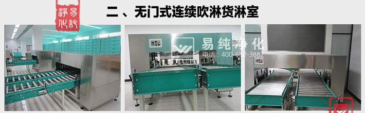 本文將重點介紹流水線貨淋室,此類貨淋室主要搭配輸送流水線配合使用。流水線是在一定的線路上連續(xù)輸進貨物搬運機械,又稱輸送線或者輸送機。按照輸送系列產(chǎn)品大體可分為皮帶流水線、滾筒線等流水線。一般包括牽引件承載構(gòu)件、驅(qū)動裝置、改向裝置和和支撐件等,輸送機可進行水平輸送。在輸送的過程中避免了人工操作,只需要設(shè)置感應(yīng)控制程序,當(dāng)物體達到或進入貨淋室內(nèi)時,貨淋室自動啟動吹淋,將進入潔凈室或包裝間的物體表面的灰塵吹干凈。